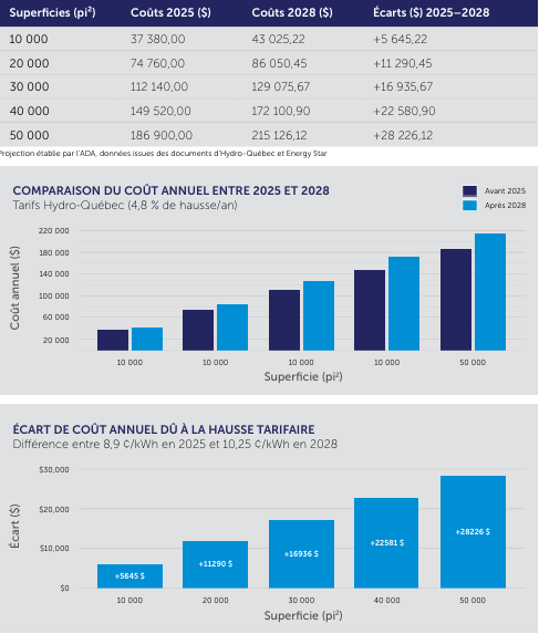 Hydro-Québec souhaite augmenter les tarifs d’électricité des commerçants et des industries de 4,8 % en 2026, 2027 et 2028 an de continuer son développement et d’assurer la sécurité énergétique québécoise. Quelles sont les implications pour les détaillants du Québec ? Selon la société d’État, le tarif moyen pour un client de petite puissance (≤ 10 000 kWh/mois, puissance appelée ~40 kW) dans la catégorie commerciale est estimé à environ 8,9 ¢/kWh4 (hors frais de transport/distribution, TPS/TVQ). Selon l’Enquête canadienne sur la consommation d’énergie des bâtiments commerciaux, la médiane d’usage d’énergie à la source est de 1,66 GJ/m²/an, soit ≈ 42 kWh/pi²/an5. Cela aura pour e et une importante augmentation d’ici l’année 2028.