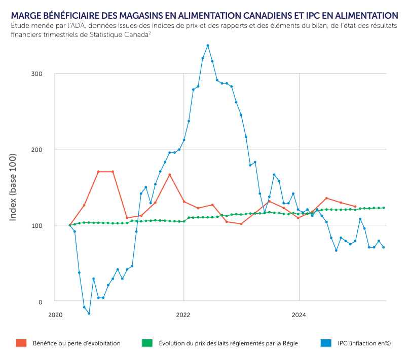On observe depuis 2020 que les résultats nanciers des détaillants alimentaires (en millions $), n’ont presque pas augmenté, tandis que le prix des produits laitiers et des produits en général a pu augmenter et diminuer sur cinq ans. La marge d’exploitation agrégée des détaillants en alimentation ne suit ni l’ampleur ni la chronologie des uctuations du prix du lait.